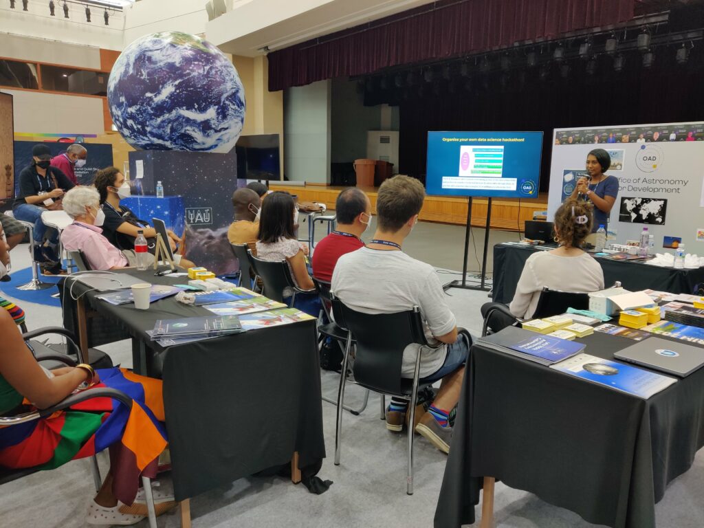 The OAD engaged visitors to its exhibition space at the IAU booth, shared with the IAU Office for Astronomy Outreach (OAO), IAU Office of Astronomy for Education (OAE), Office for Young Astronomers (OYA), and the new Centre for the Protection of Dark and Quiet Skies from Satellite Constellation Interference (CPS). This was matched by a complementary online exhibition space. OAD Fellows Tawanda Chingozha, Armine Patatanyan, and Nikhita Madanpall also gave short talks at the exhibition which were very well received. Team members met with people from the various OAD and IAU networks, including the IAU Executive, Regional Offices, projects, other Offices networks, IAU Divisions and Working Groups.