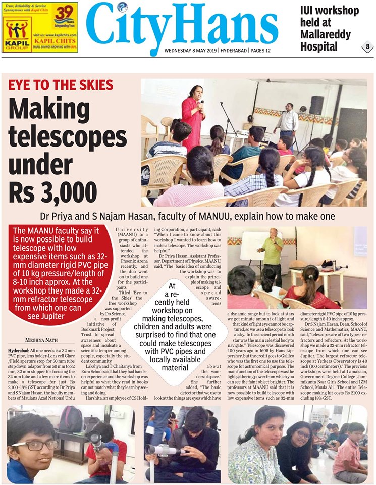 May, 2019, “Telescope Making Workshop”, A free astronomy workshop for students Talks followed by hands-on session on making telescope, Phoenix Arena, Hyderabad