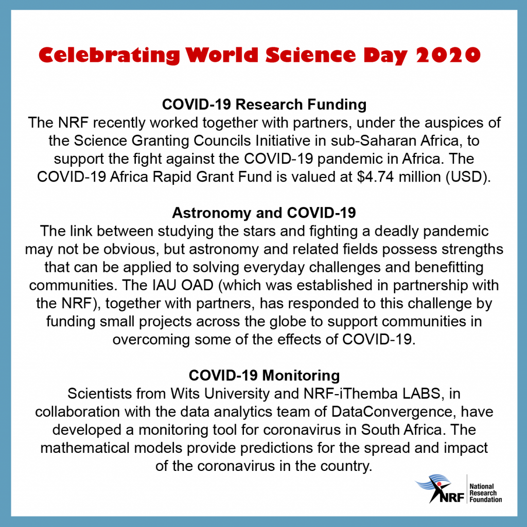 The focus this year is on “Science for and with society in dealing with the global pandemic.” The National Research Foundation of South Africa, in a press release, has recognized the role of science including astronomy and the efforts of the OAD and the global astro4dev community in the fight against COVID-19.